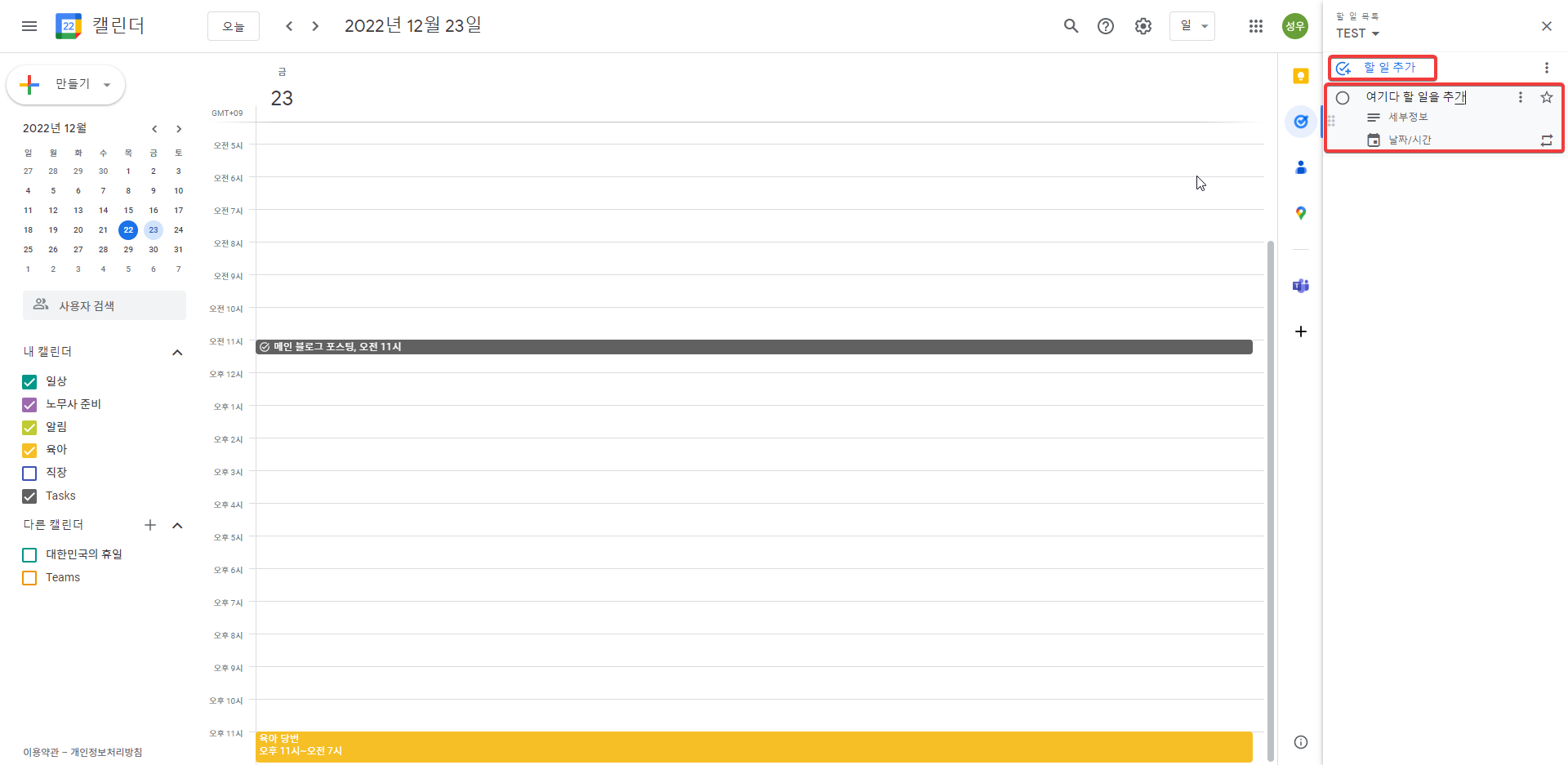 할 일을 추가 했다. 빨간 네모에서 파란 글씨 할 일 추가를 누르면 추가 가능하다.