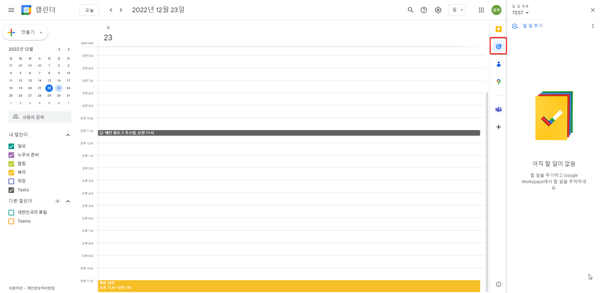 지금은 테스트를 위해서 구글태스크에 추가해둔 [메인블로그 포스팅 하기] 라는 할 일 하나 빼고는 다 지워둔 상태다.