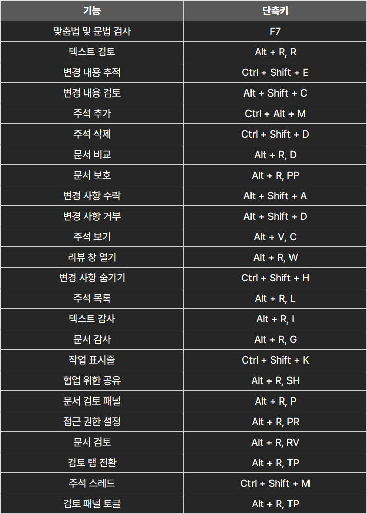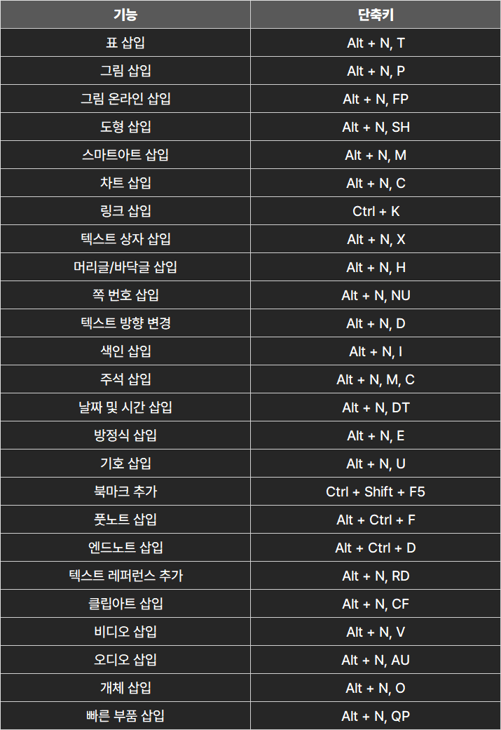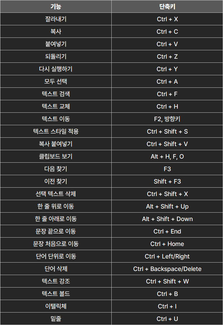 ■ 칼퇴를 위한 단축키 워드 단축키 by 포탈메이커 2024. 8. 2. 워드 단축키 여러분의 칼퇴를 위한 워드 단축키. 칼퇴 키트 바로가기 목차 1. 문서 관리 단축키 2. 텍스트 편집 단축키 3. 포맷 및 레이아웃 단축키 4. 검토 및 협업 단축키 5. 삽입 기능 단축키 6. 보기 및 기타 기능 단축키 1. 문서 관리 단축키 워드 단축키 2. 텍스트 편집 단축키 워드 단축키 3. 포맷 및 레이아웃 단축키 워드 단축키 4. 검토 및 협업 단축키 워드 단축키 5. 삽입 기능 단축키 워드 단축키 6. 보기 및 기타 기능 단축키 워드 단축키 포스팅이 도움이 되셨다면 구독, 공감, 댓글 부탁드려요! 행복한 하루 되세요! 공유하기 게시글 관리 귀환포탈 저작자표시 비영리 변경금지 (새창열림) '■ 칼퇴를 위한 단축키' 카테고리의 다른 글 구글태스크 단축키 (0) 2024.08.03 윈도우 단축키 (0) 2024.08.03 한글 단축키 (0) 2024.08.02 파워포인트 단축키 (0) 2024.08.02 엑셀 단축키 (0) 2024.07.31 관련글 윈도우 단축키 한글 단축키 파워포인트 단축키 엑셀 단축키