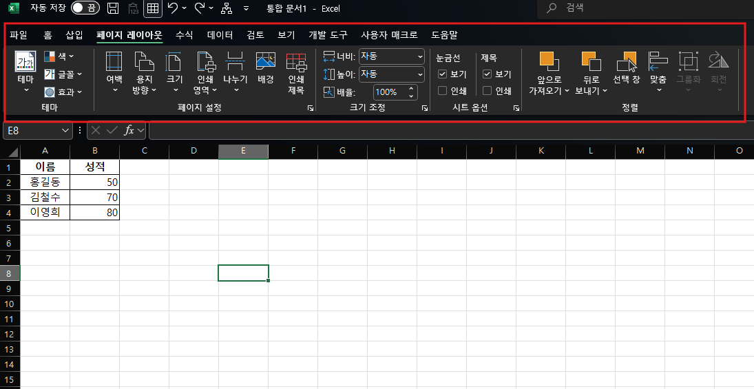 - 페이지 레이아웃 탭: 리본 메뉴에서 페이지 레이아웃(Page Layout) 탭을 클릭하면 페이지 설정, 인쇄 영역 지정, 시트 옵션 등을 설정할 수 있는 다양한 옵션이 제공됩니다.