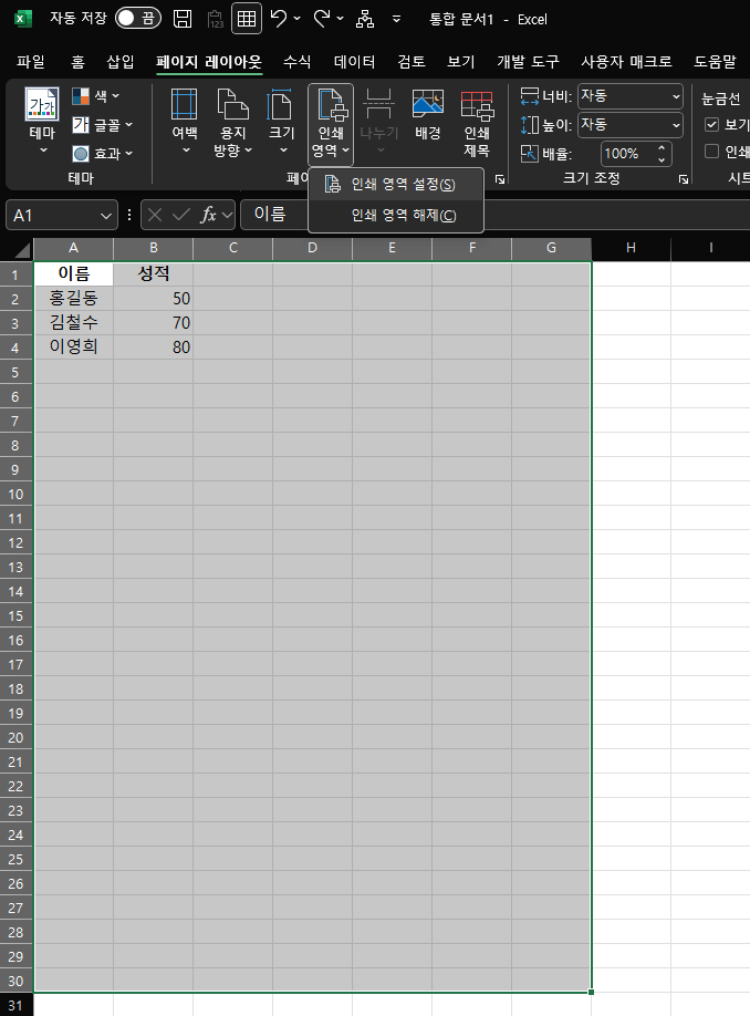 - 인쇄 영역 해제: 이전에 설정한 인쇄 영역을 해제하려면 인쇄 영역(Print Area) > 인쇄 영역 해제(Clear Print Area)를 선택하면 됩니다.