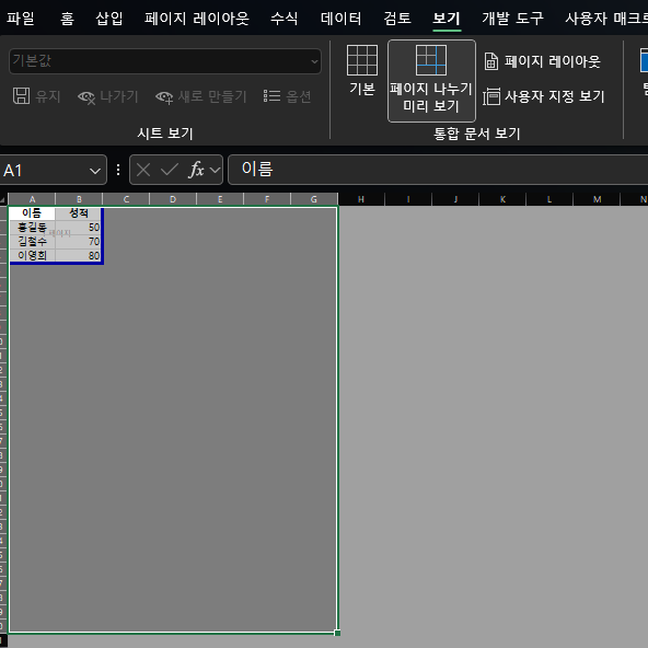 - 페이지 나누기 미리 보기: 보기(View) 탭에서 페이지 나누기 미리 보기(Page Break Preview)를 선택하면 현재 설정된 페이지 나누기를 시각적으로 확인할 수 있습니다. 이 모드에서는 페이지 경계선을 직접 드래그하여 페이지 나누기를 조정할 수 있습니다.