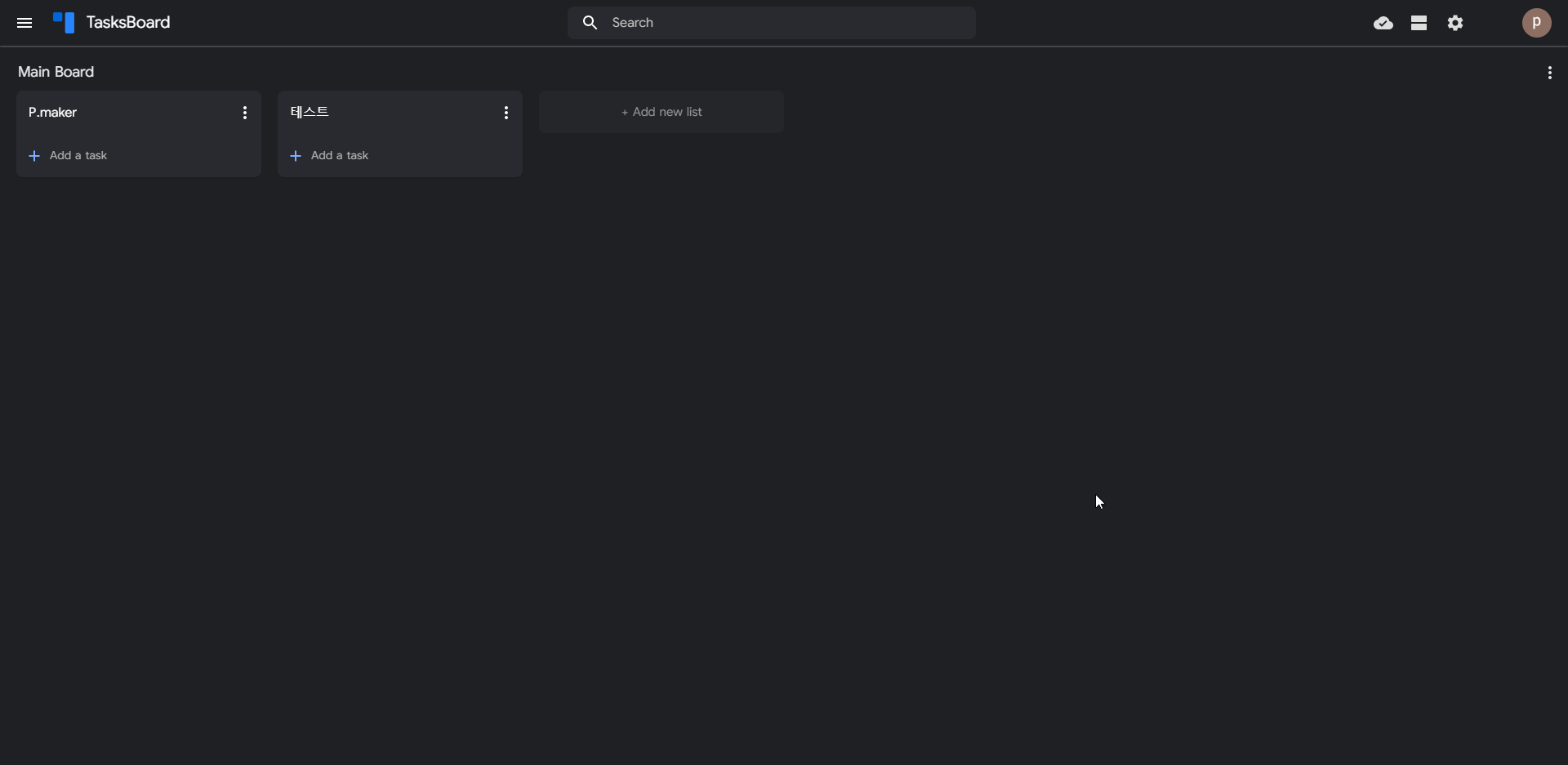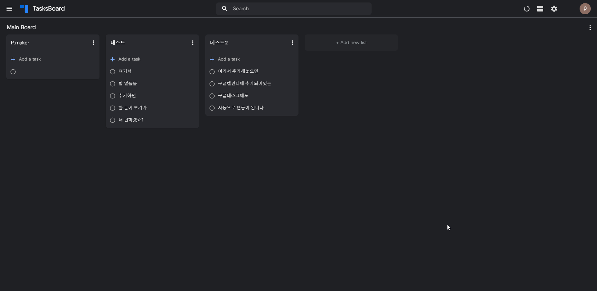 목록을 오른쪽에 하나 더 만들었다. 눈치 빠른 분들은 이게 뭘 위해 필요한 기능인지 알 수 있을 것이다. 구글캘린더에서는 목록을 눌러야 그 목록 안에 있는 리스트를 확인할 수 있지만 이 태스크보드는 한 눈에 볼 수 있다.