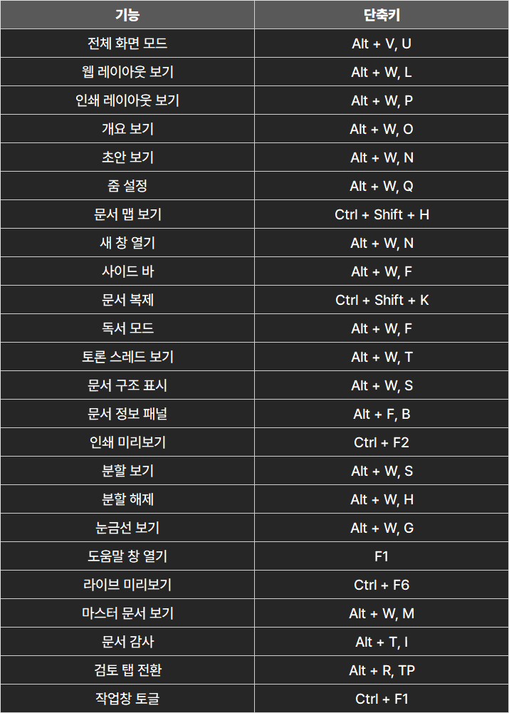 ■ 칼퇴를 위한 단축키 파워포인트 단축키 by 포탈메이커 2024. 8. 2. 파워포인트 단축키 여러분의 칼퇴를 위한 파워포인트 단축키. 칼퇴 키트 바로가기 목차 1. 프레젠테이션 관리 단축키 2. 슬라이드 편집 단축키 3. 디자인 및 레이아웃 단축키 4. 검토 및 협업 단축키 5. 삽입 기능 단축키 6. 보기 및 기타 기능 단축키 1. 프레젠테이션 관리 단축키 파워포인트 단축키 2. 슬라이드 편집 단축키 파워포인트 단축키 3. 디자인 및 레이아웃 단축키 파워포인트 단축키 4. 검토 및 협업 단축키 파워포인트 단축키 5. 삽입 기능 단축키 파워포인트 단축키 6. 보기 및 기타 기능 단축키 파워포인트 단축키 포스팅이 도움이 되셨다면 구독, 공감, 댓글 부탁드려요! 행복한 하루 되세요! 공유하기 게시글 관리 귀환포탈 저작자표시 비영리 변경금지 (새창열림) '■ 칼퇴를 위한 단축키' 카테고리의 다른 글 구글태스크 단축키 (0) 2024.08.03 윈도우 단축키 (0) 2024.08.03 한글 단축키 (0) 2024.08.02 워드 단축키 (0) 2024.08.02 엑셀 단축키 (0) 2024.07.31 관련글 윈도우 단축키 한글 단축키 워드 단축키 엑셀 단축키