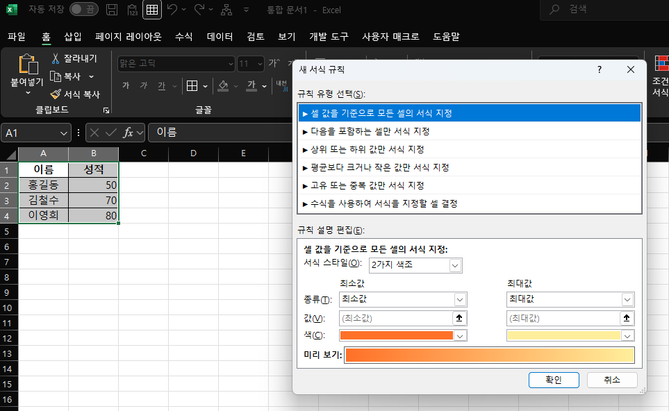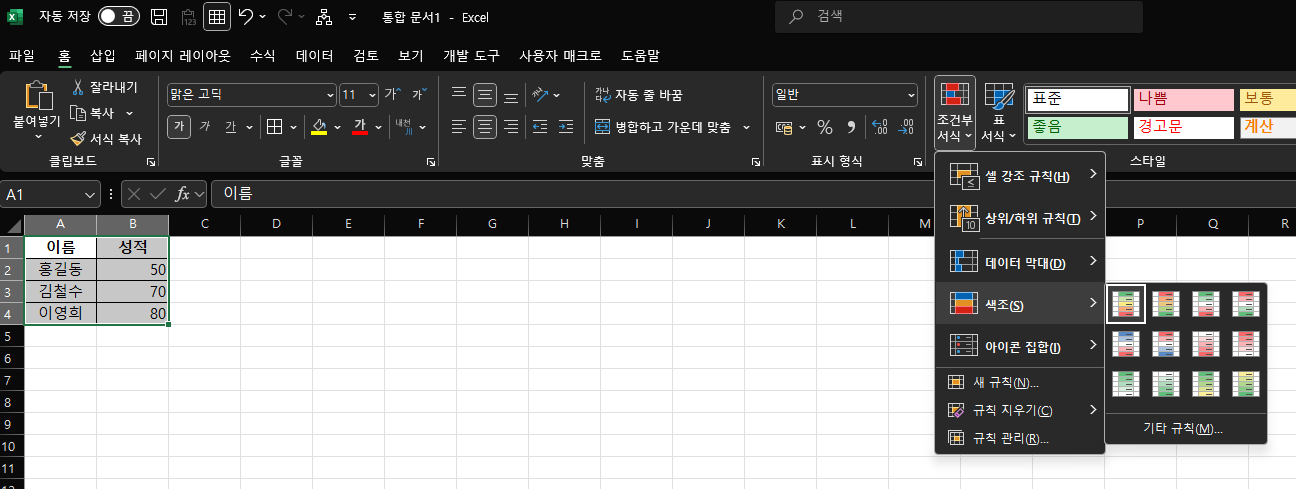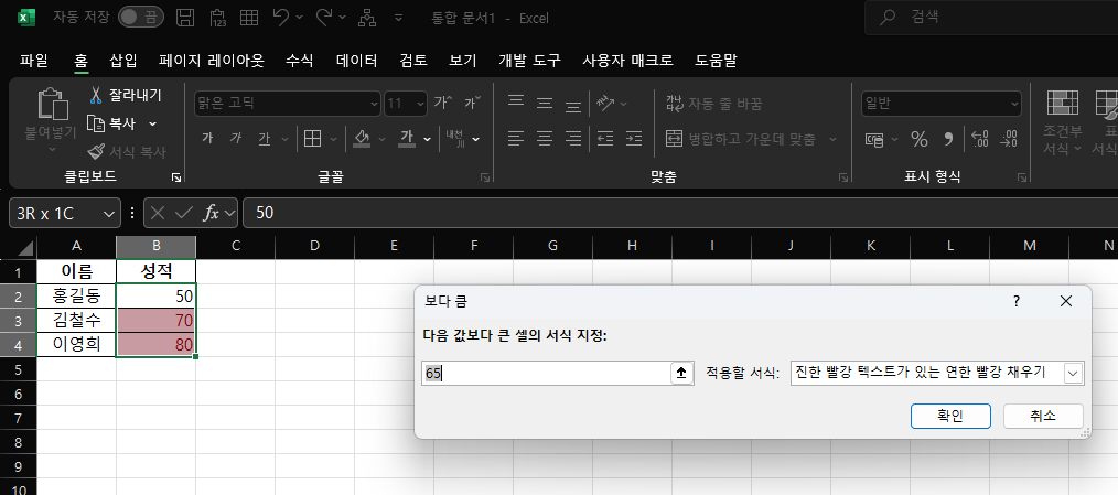 - 예시: 70점 이상인 점수를 강조하고 싶다면, 크다(Greater Than) 옵션을 선택한 후 70을 입력하고, 서식을 지정합니다(예: 녹색 배경).
