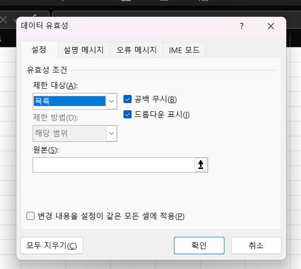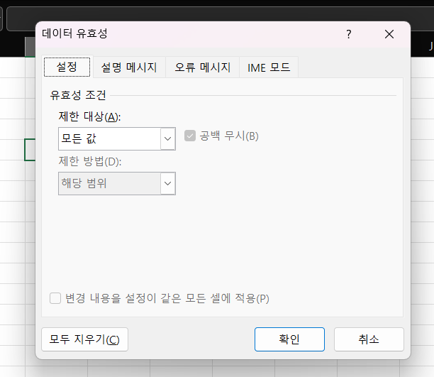 - 조건 설정: 대화 상자의 설정(Settings) 탭에서 유효성 검사를 위한 조건을 설정할 수 있습니다. 여기서는 입력할 수 있는 데이터의 유형과 조건을 정의할 수 있습니다.