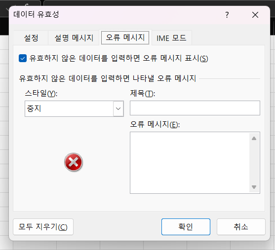 - 오류 메시지 설정: 오류 메시지(Error Alert) 탭에서 잘못된 데이터가 입력될 때 표시할 오류 메시지를 설정할 수 있습니다.
