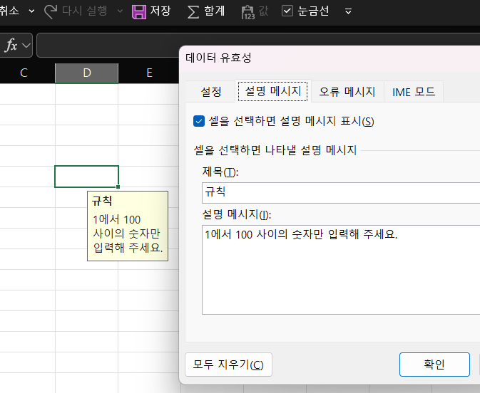 - 예시: "1에서 100 사이의 숫자만 입력해 주세요."라는 메시지를 설정하면, 사용자가 셀을 클릭할 때 해당 메시지가 나타납니다.