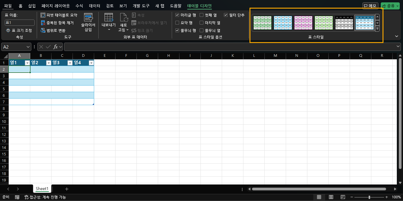 - 스타일 미리보기: 마우스를 다양한 스타일에 가져가면 표에 실시간으로 미리 보기가 적용됩니다. 이를 통해 여러 스타일을 비교한 후 가장 적합한 스타일을 선택할 수 있습니다.