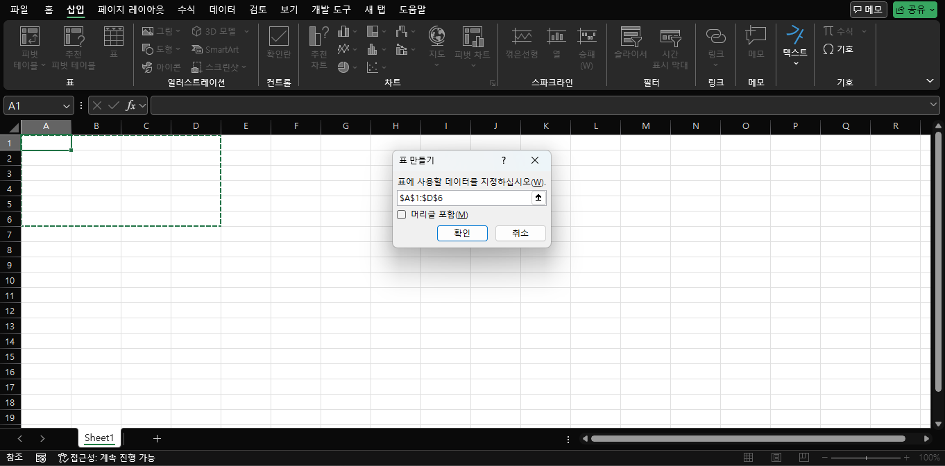 - 표 삽입: 범위를 선택한 상태에서 리본 메뉴의 삽입(Insert) 탭을 클릭한 다음, 표(Table) 버튼을 클릭합니다. 그러면 '표 만들기' 대화 상자가 나타납니다.