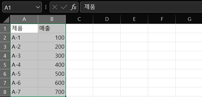 - 데이터 선택: 먼저, 차트로 만들 데이터를 포함한 셀 범위를 선택합니다. 예를 들어, 부서 이름과 각 부서의 매출 데이터를 선택합니다.