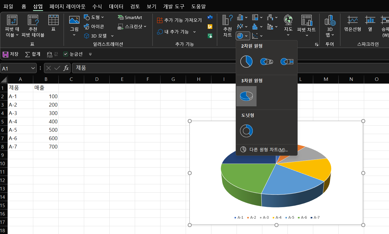 - 차트 삽입: 데이터를 선택한 상태에서 리본 메뉴의 삽입(Insert) 탭을 클릭하고, 차트(Chart) 그룹에서 원형 차트(Pie Chart) 아이콘을 선택합니다. 기본 원형 차트, 3D 원형 차트, 도넛형 차트 등 여러 옵션 중 하나를 선택할 수 있습니다.