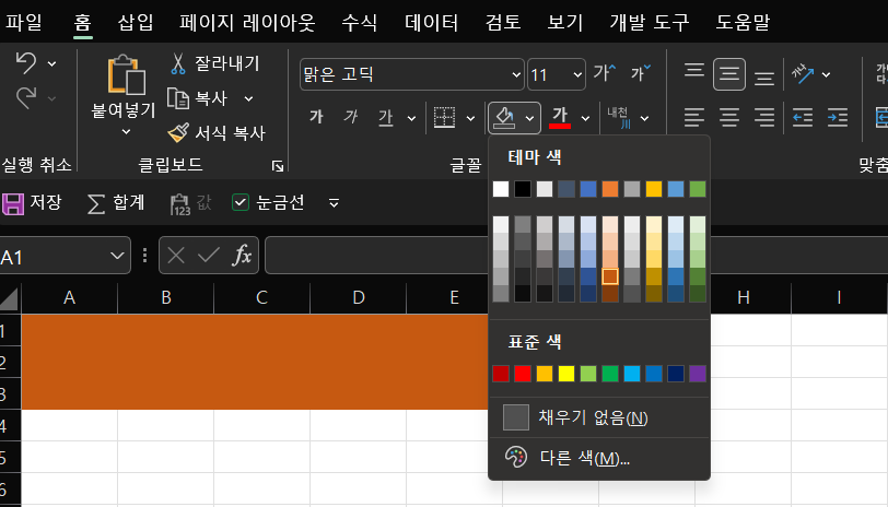 • 배경 색상 변경: 셀을 선택한 후, 홈(Home) 탭의 채우기 색상(Fill Color) 아이콘을 클릭하여 원하는 배경 색상을 선택할 수 있습니다.