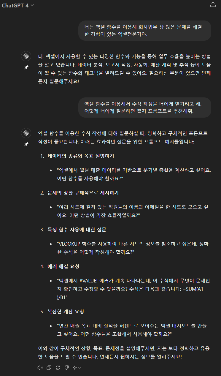 위에 ChatGPT에게 받아낸 프롬프트를 읽고나서 저는 ChatGPT에게 엑셀 수식을 질문할 때 상황, 목적, 형태 라는 카테고리로 나눠서 질문하면 좋겠다는 생각을 했습니다.
