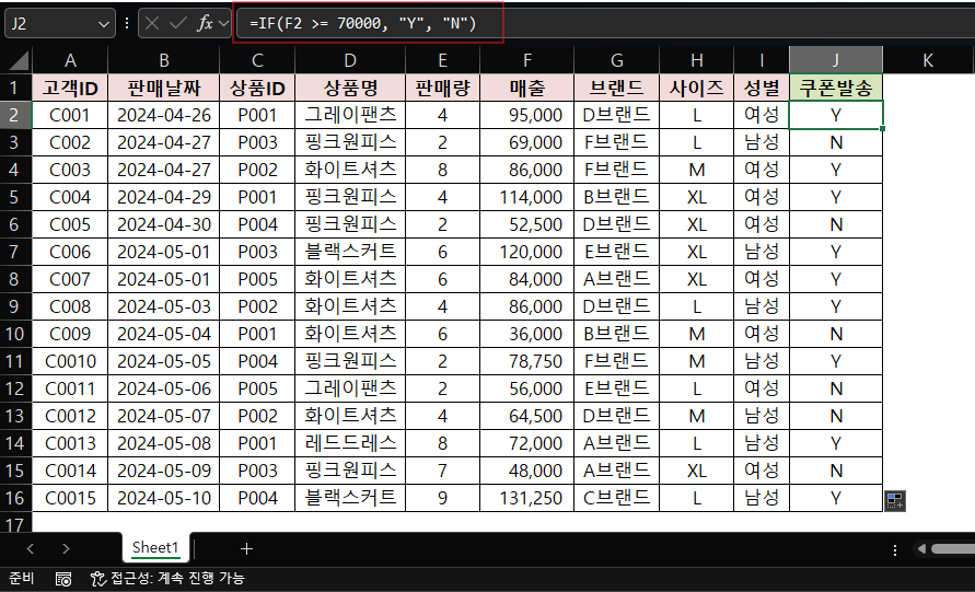 우리가 원하는대로 매출이 70,000원 이상인 고객은 J열에 Y값이, 70,000원 미만인 고객은 J열에 N값이 도출되는 것을 볼 수 있습니다.
