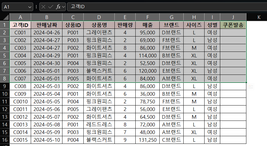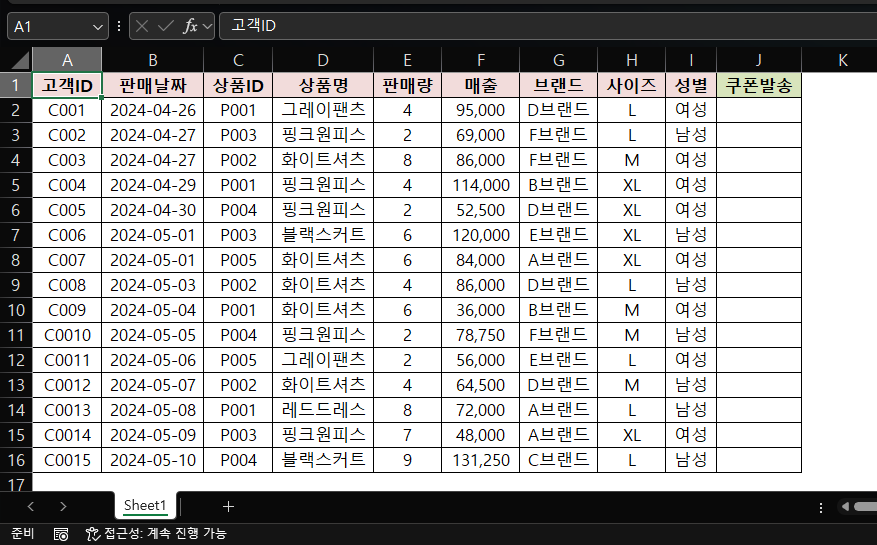 고객ID 판매날짜 상품ID 상품명 판매량 매출 브랜드 사이즈 성별 쿠폰발송 C001 2024-04-26 P001 그레이팬츠 4 95,000 D브랜드 L 여성 C002 2024-04-27 P003 핑크원피스 2 69,000 F브랜드 L 남성 C003 2024-04-27 P002 화이트셔츠 8 86,000 F브랜드 M 여성 C004 2024-04-29 P001 핑크원피스 4 114,000 B브랜드 XL 여성 C005 2024-04-30 P004 핑크원피스 2 52,500 D브랜드 XL 여성 C006 2024-05-01 P003 블랙스커트 6 120,000 E브랜드 XL 남성 C007 2024-05-01 P005 화이트셔츠 6 84,000 A브랜드 XL 여성