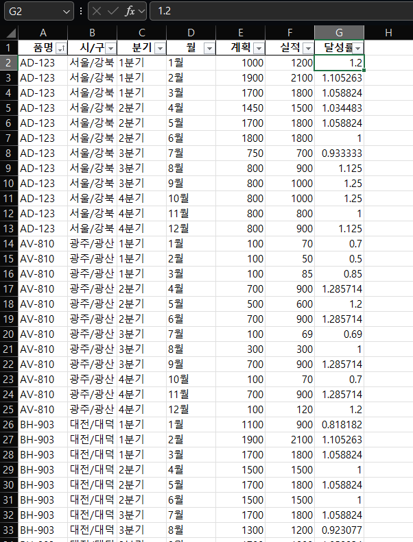 이 엑셀파일에서 G열은 원래 실적을 계획으로 나눈 수식이 들어가고 백분율 서식으로 입력되어야 합니다.