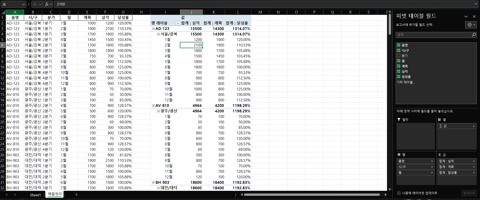 G열의 달성률이 백분율로 잘 바뀌었고 피벗테이블도 우리가 계획한대로 잘 만들어졌습니다!